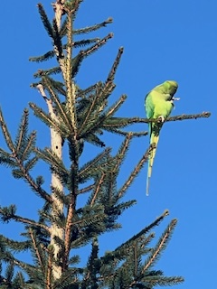 A small bird with a red chest perched on a ledge near a weathered wooden wall and a large blue plastic barrel outside.